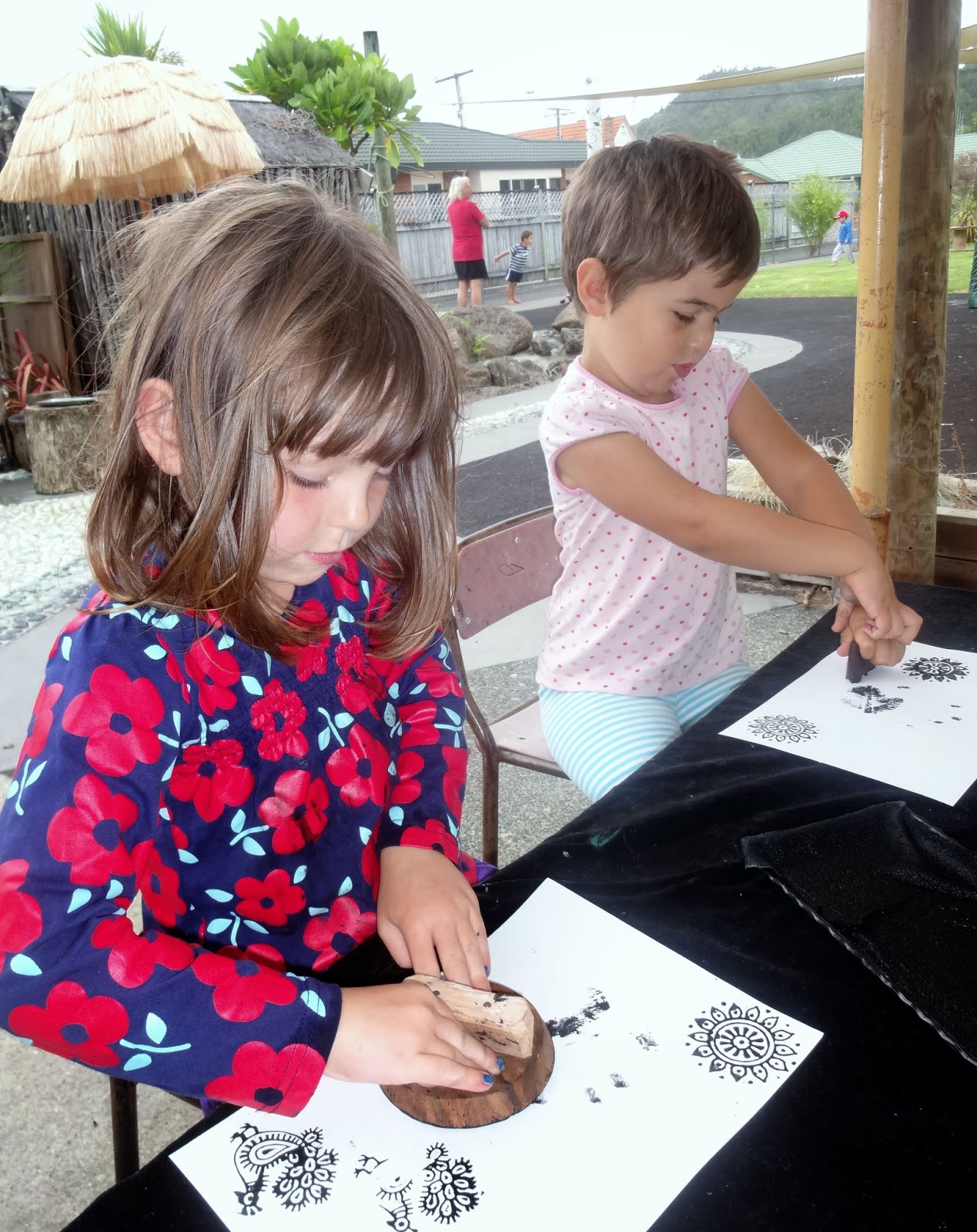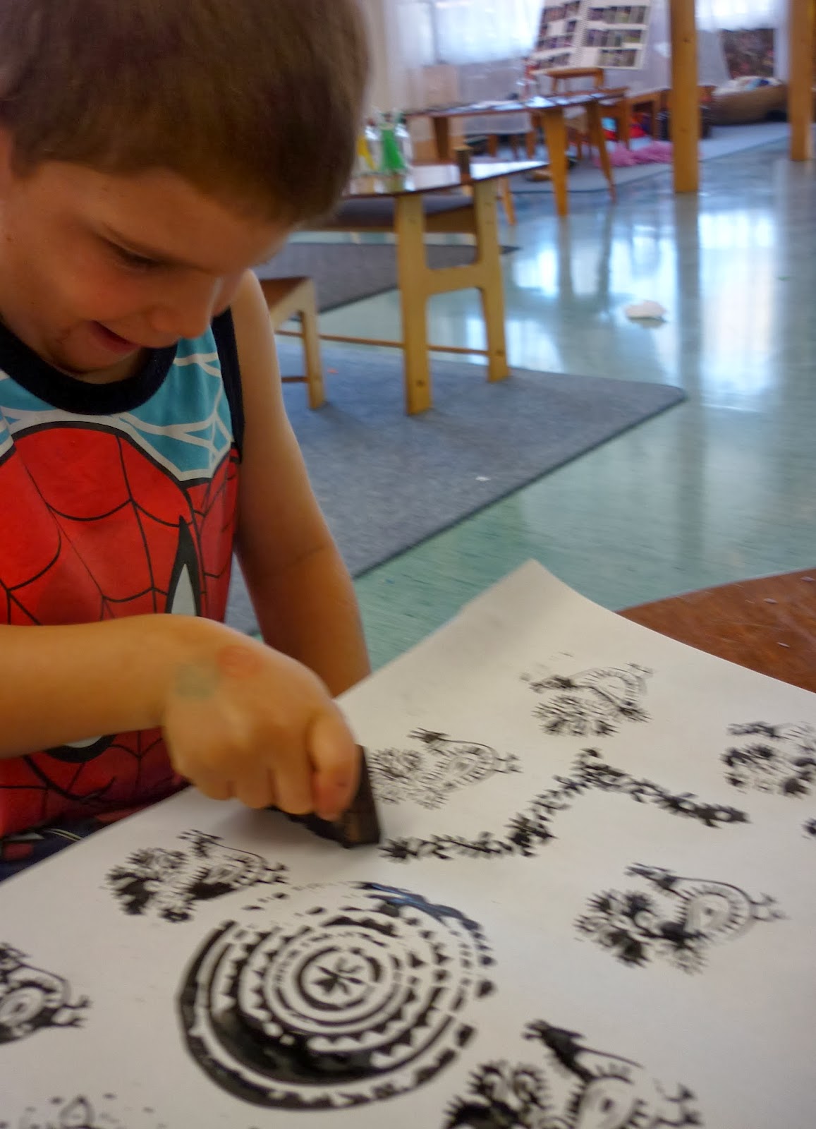 of the children made quick stamp movements reenacting the same sequence for printing with a rubber stamp pad, however working with ink and woodcut stamps requires slowing down and precision; the children quickly discovered
