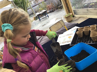 biodegradable pot, filling it with soil then sowing their own special sunflower