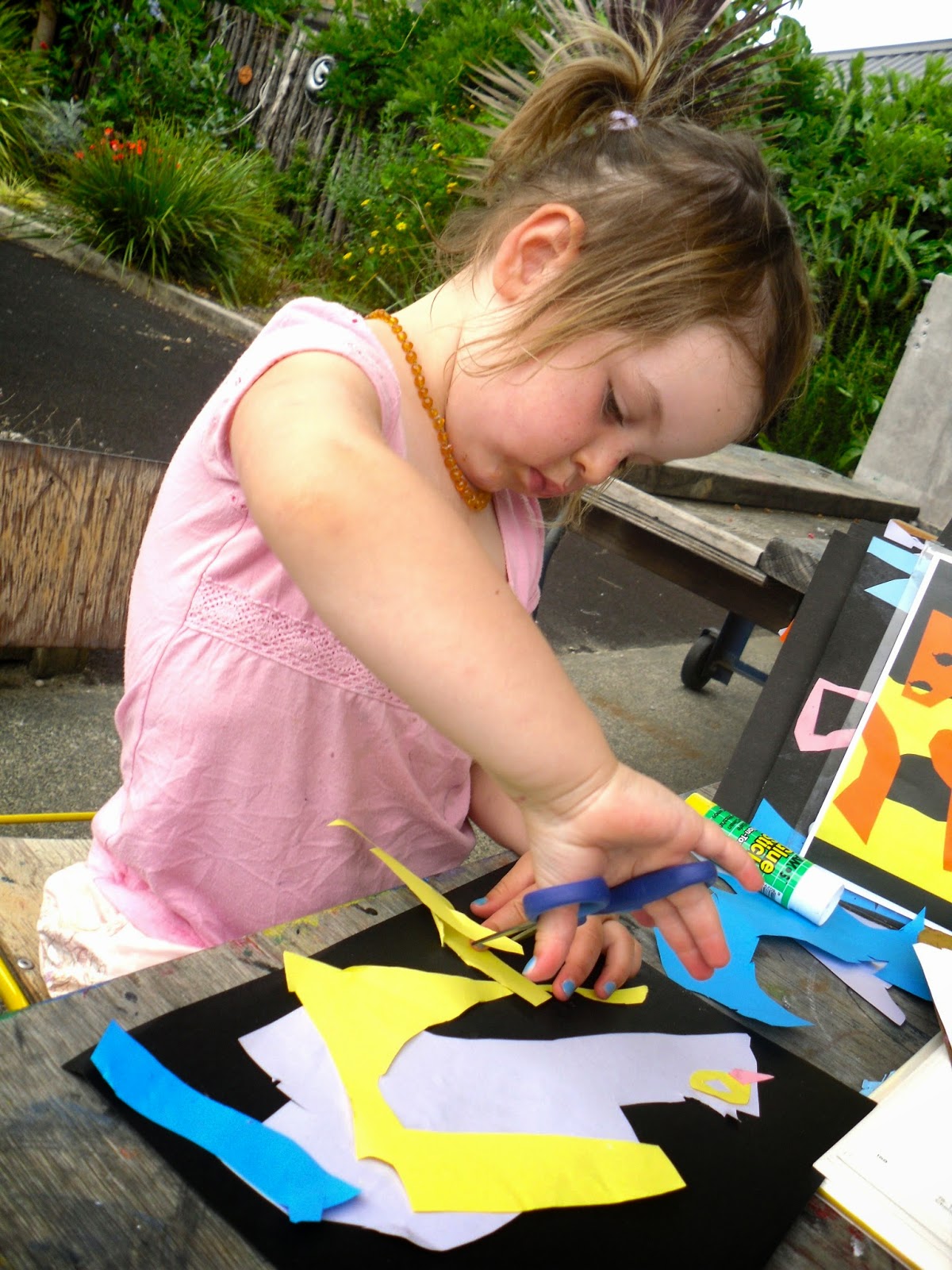 Emma told the group as she worked on her first cut out: ‘I find it strange that we don’t use pens cause I want to do eyes but instead I did the eyes with paper. It made me a little bit nervous, but it looks so so beautiful.’ Then later, as she became more familiar with this method of creating art she cheerfully told children who were just beginning their work into Matisse, ‘We don’t use pens, we cut the shapes out and we can’t colour, we use paper, it’s hard work, it’s making me tired, but I like it!’