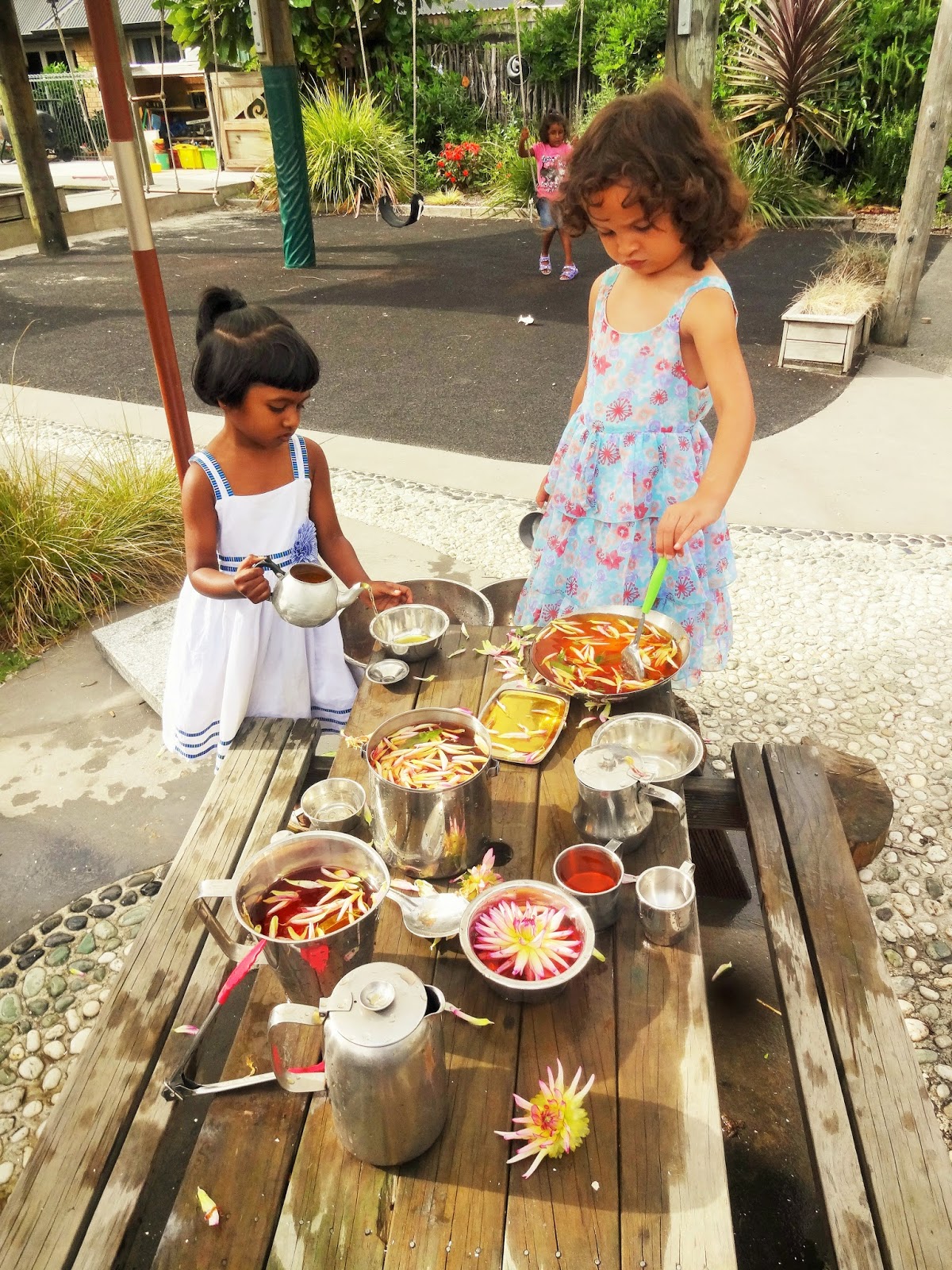 Our children engage in water play on a daily basis. Whether it is containers filled with vibrant coloured water, a water trough set up with hoses and funnels, our wonderful river bed flowing or taps in the sand pit with pipes and spades; it is a resource that is utilised constantly. It often is a platform for supporting children in building relationships with one another, opening up opportunities to share lots of dialogue and learning about taking turns, sharing and negotiating. It allows for our children to explore mathematical and scientific concepts, testing and playing with ideas and just being at one with this lovely natural resource. Water play is often open ended and transportable therefore children are able to be creative and use their imagination to build on their play. Water celebrates exploration, with lots of children’s senses being utilised while engaged with the resources. It is wonderful on its own and also when it is mixed with other natural resources like sand, dirt, flowers, leaves or bark. Time spent playing with water is often filled with calmness, concentration and delight (unless it involves jumping and splashing in the river bed or muddy puddles, then it is full-noise fun!). The benefits of playing with water are rich and meaningful in terms of children learning about their world.